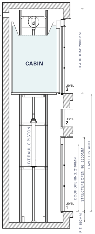 Powered by a hydraulic cylinder system, this lift delivers smooth, quiet vertical movement and can be installed in buildings up to three storeys. In the event of a power failure, a manual lowering valve ensures safe evacuation from the lift car—adding an important safety layer.